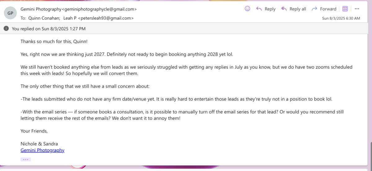 It’s an automated system of emails and texts that keeps couples engaged after they inquire. Instead of sending one reply and hoping for the best, you have a sequence that warms them up and pushes them closer to booking.